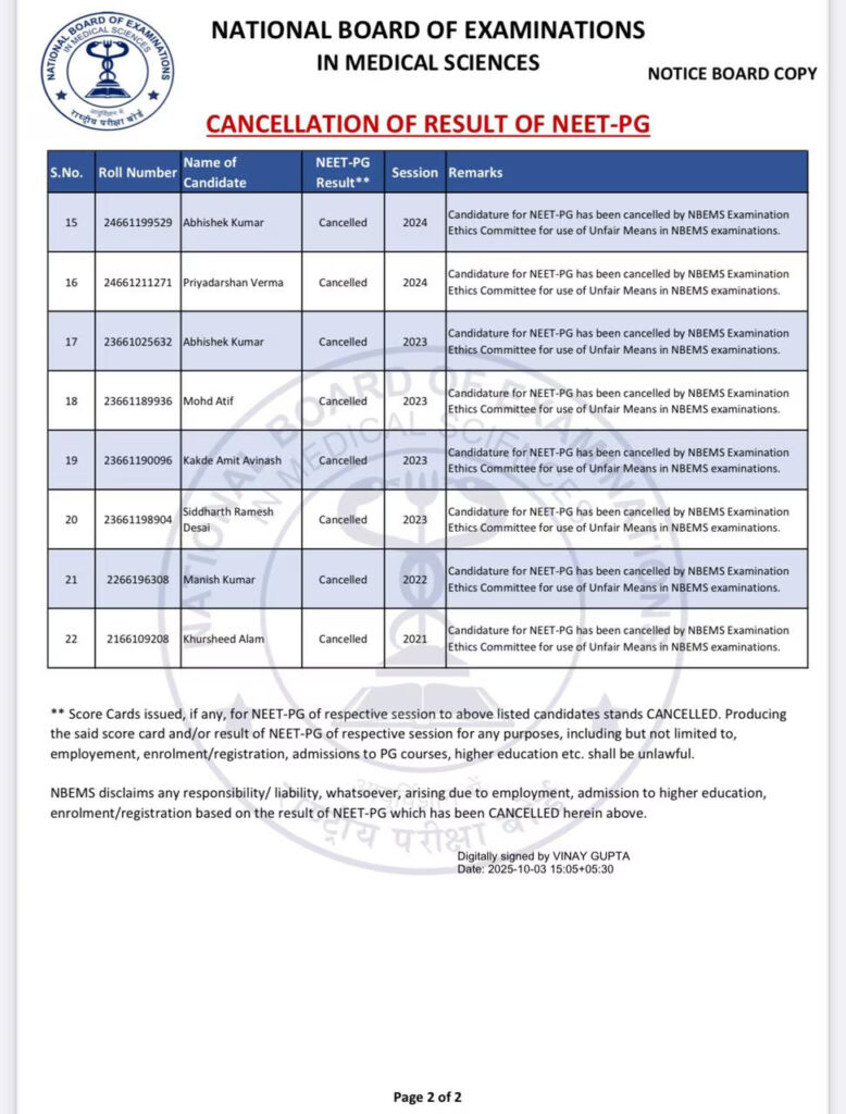 Additionally, one candidate’s result was cancelled following the outcome of Writ Petition No. 5785 of 2025 before the Karnataka High Court. The NBEMS stated that such actions are necessary to maintain transparency and fairness in the postgraduate medical examination process.