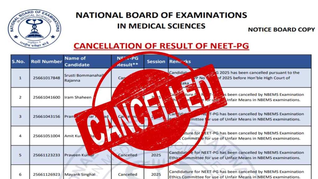 The National Board of Examinations in Medical Sciences (NBEMS) has officially cancelled the NEET PG result for 22 candidates. The decision follows an internal ethics review that found violations of exam conduct rules and one case resolved through a court order.